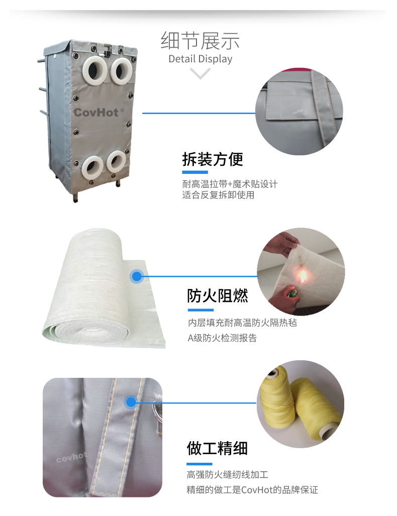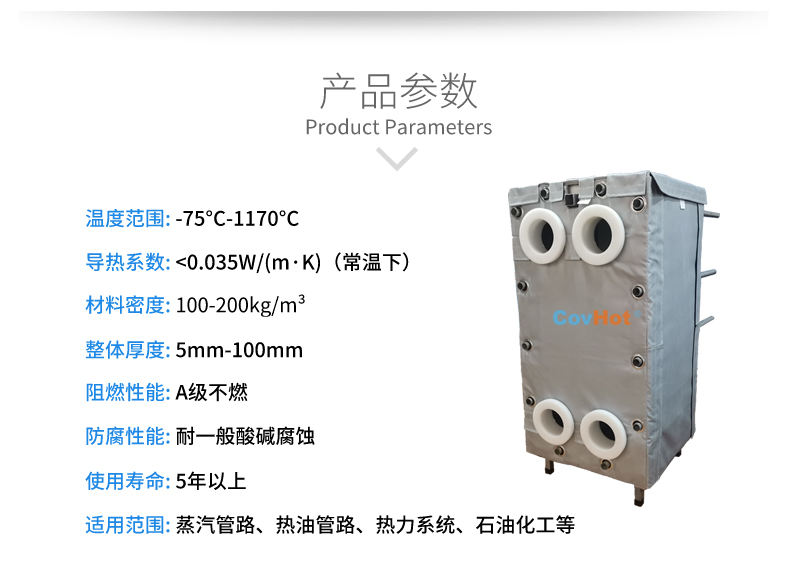 針對(duì)以上的問題,河北科好特科技有限責(zé)任公司自主研發(fā)的節(jié)能型板換保溫衣,可以有效減少換熱器的熱量損耗,而且在施工過程中安裝拆卸方便,節(jié)省人工,可拆卸保溫衣還可重復(fù)使用,起到節(jié)能降耗的效果??坪锰?a href=http://m.ltty168.cn/e/tags/?tagname=%E5%8F%AF%E6%8B%86%E5%8D%B8%E4%BF%9D%E6%B8%A9%E8%A1%A3 target=_blank class=infotextkey>可拆卸保溫衣根據(jù)設(shè)備不同的尺寸形狀量身定制,可廣泛用于換熱器、閥門、管道及其它需要保溫或防凍的領(lǐng)域。